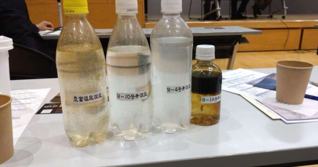 4本のペットボトルに入った温泉水を参加者全員に回していただけて