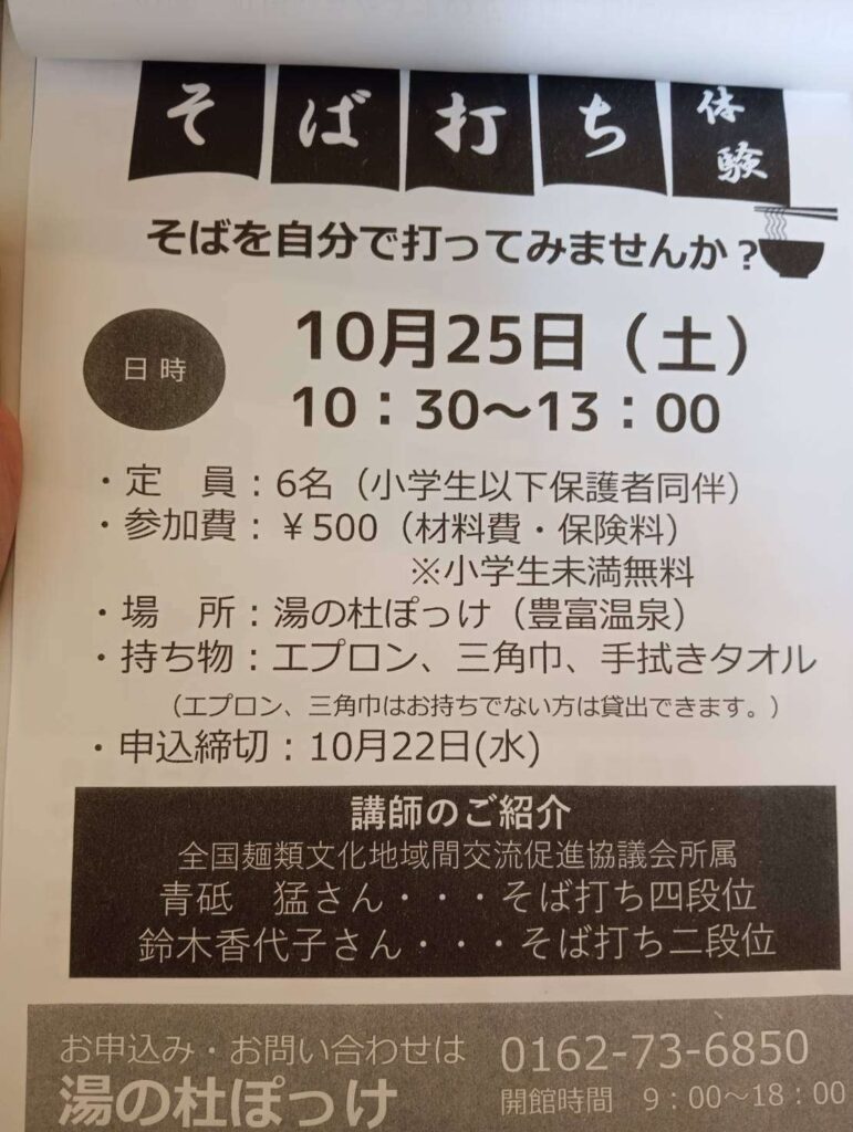 豊富温泉・湯の杜ぽっけで激安のそば打ち体験、早速申し込ませていただきました。
