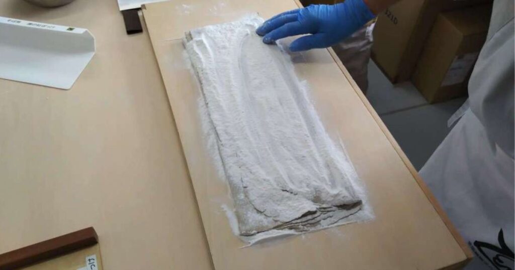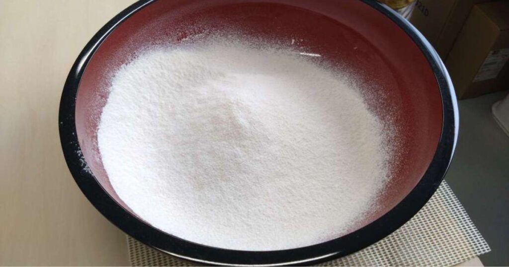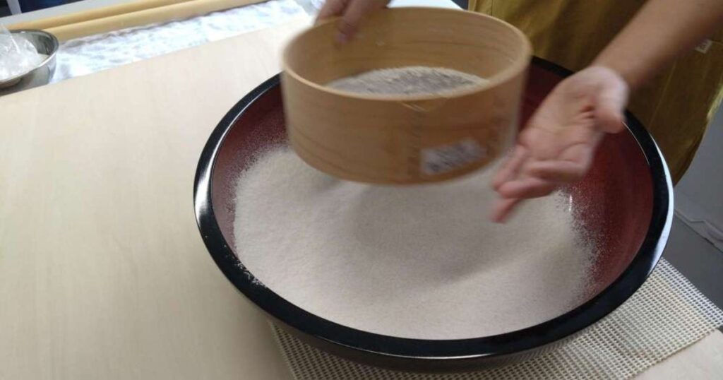 ある程度切れたら、軽く振るようにして余分な粉を落としてバットに置きます。