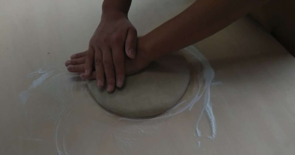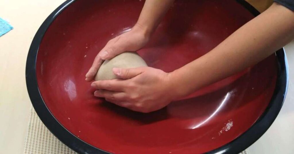 両手を重ねて、小指側で鏡餅のようなそば生地を広げていきます。