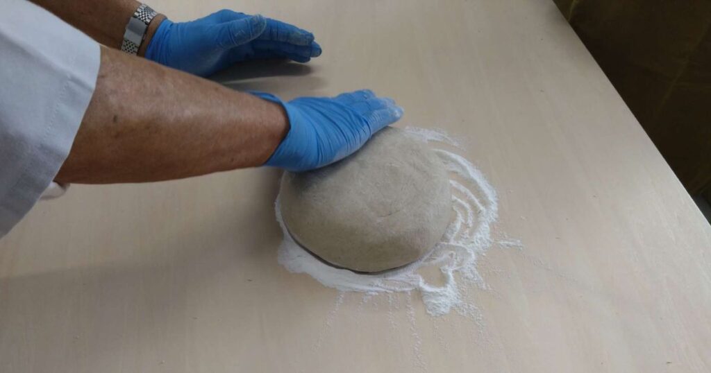 らっきょの形になったら、とんがりを上にして置いて、上から手のひらでグッと押し込み、空気を抜きます。