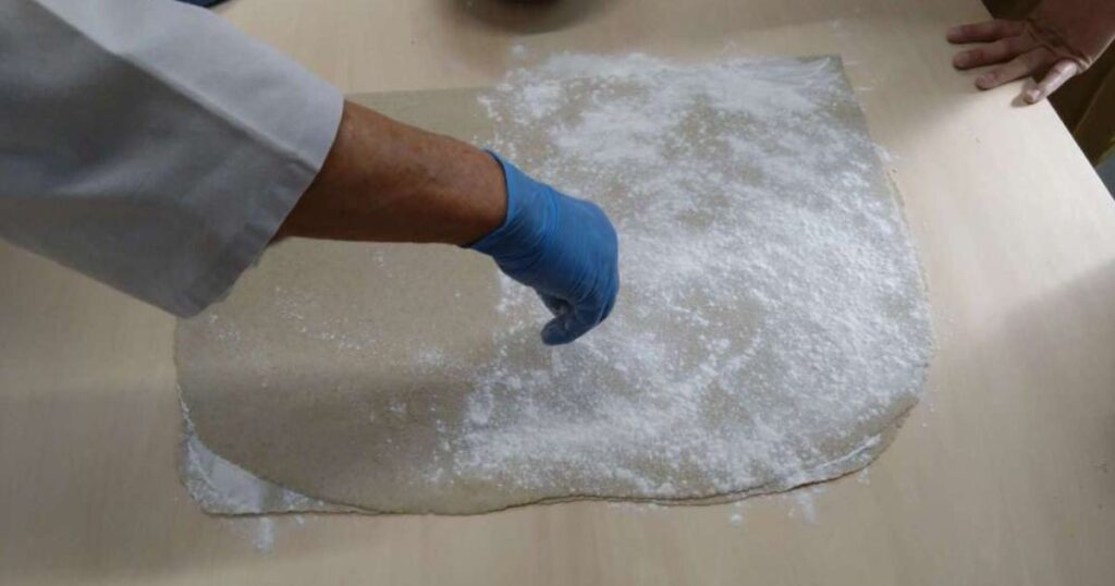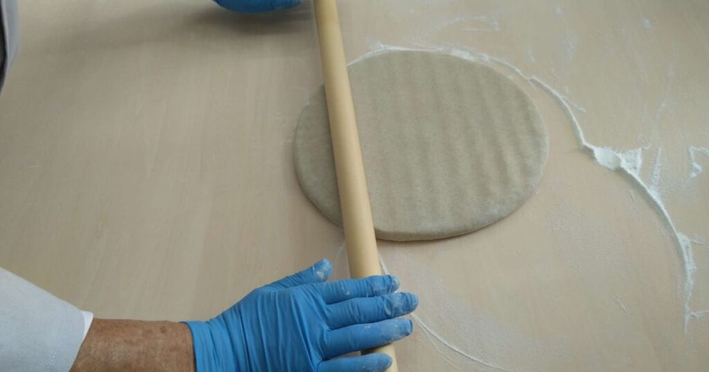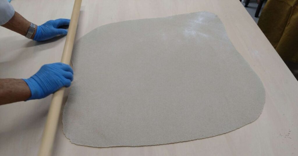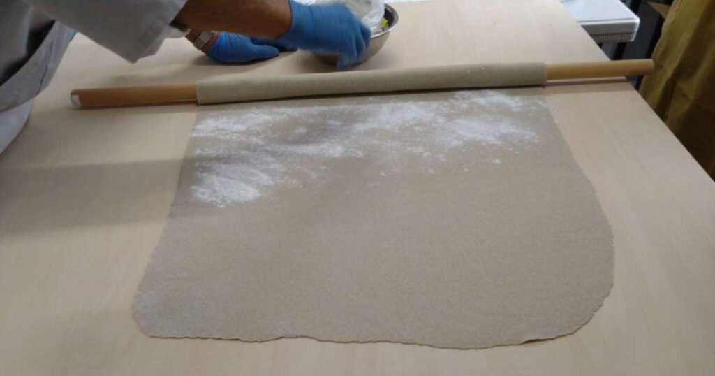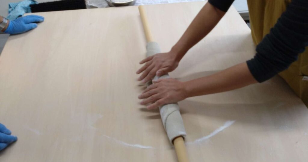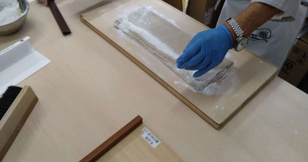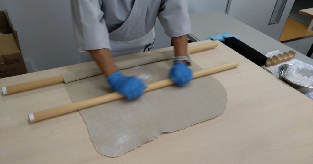 棒たちをお片付けして、半分だけ打ち粉して折りたたんでいきます。