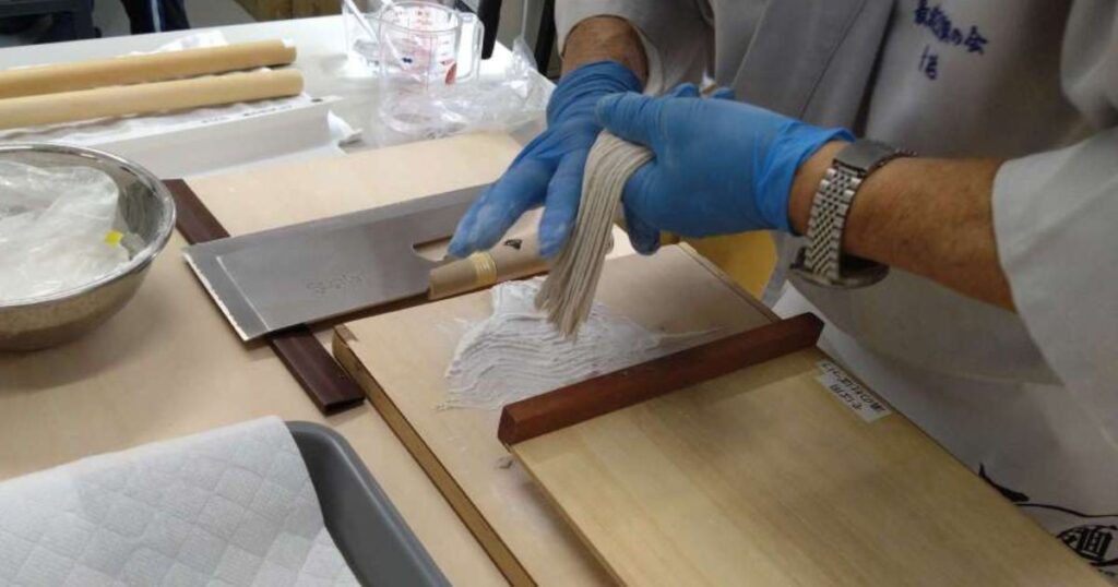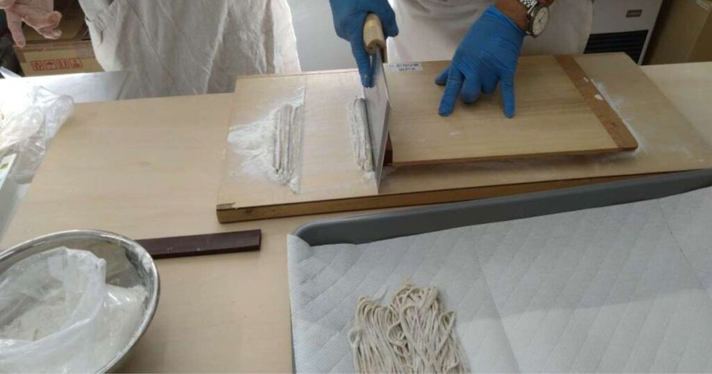 しっかり道具がそろった環境で、水加減、こね具合、のし具合を師匠に確認していただきながらのそば打ち体験。